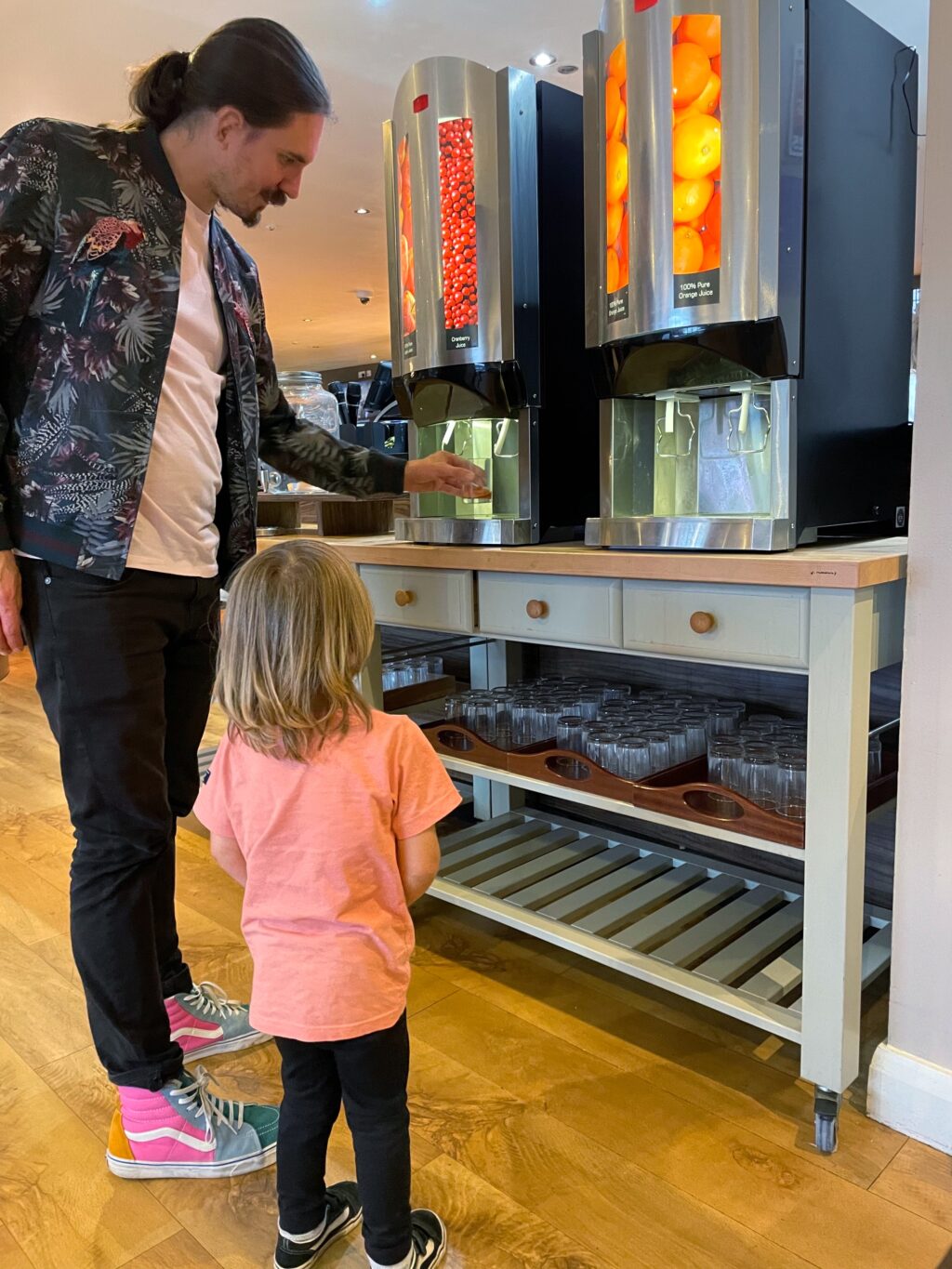 They offer a full buffet breakfast which we all enjoyed before our second day of exploring Milton Keynes. Seriously, the breakfast buffet was really good and I think it was my son’s first time experiencing one so he had a lot of fun filling up his own orange juice and having fruit, a hash brown and a muffin for breakfast. There was a selection of cereals with regular milk and several milk alternatives to pick from, a porridge station with lots of toppings, fresh fruit, continental style meats and cheeses, a full English station and of course, a sweet selection of pastries and muffins. Everything had labels to say what they contained but if you have severe allergies then it’s always important to double check with the staff. There was something for everyone and it was the perfect way to fuel up before our day exploring more of Milton Keynes.