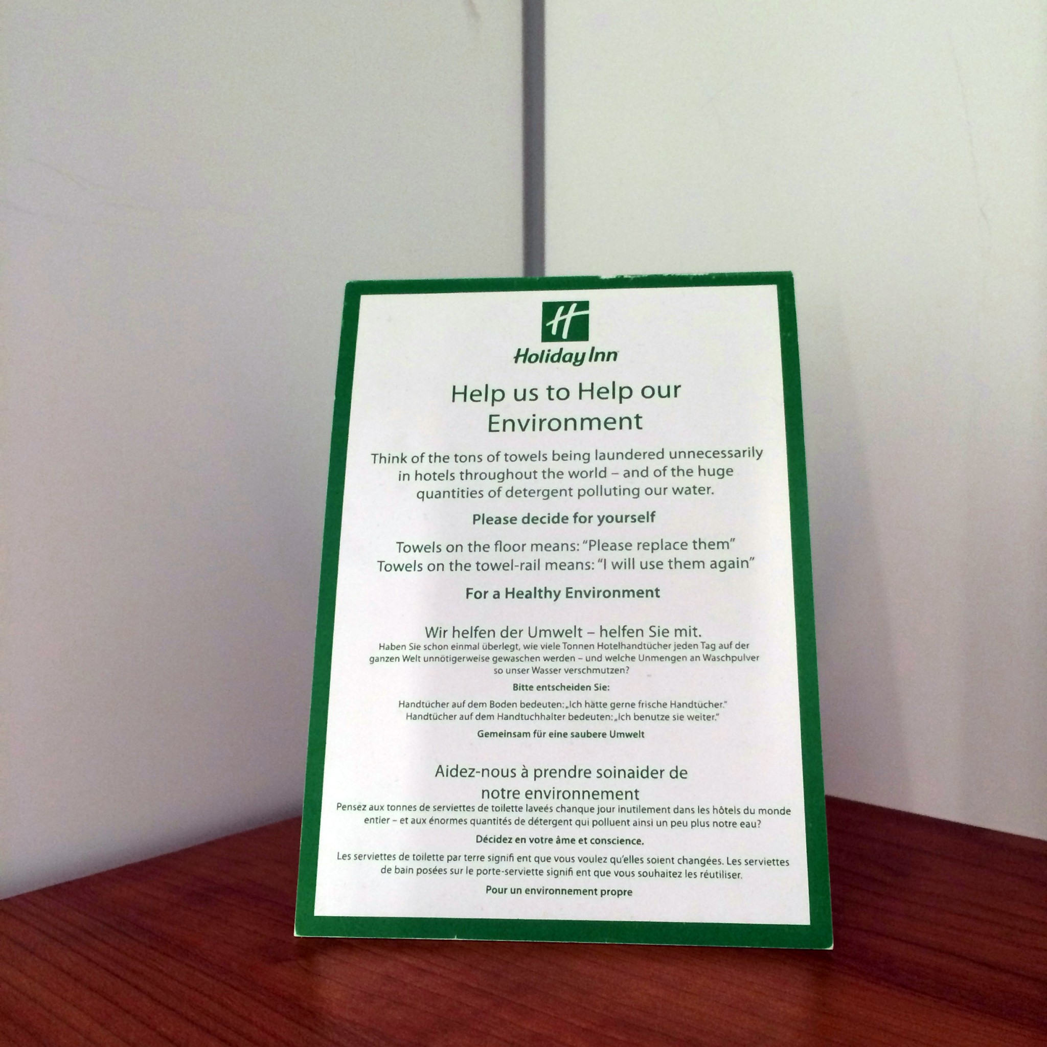 Something that really stood out to me was this little sign. Hotels have always taken away the towels dumped on the floor and replaced them with a new one on a daily basis. This is such as waste and it’s not something you’d do at home. Or maybe it is, who knows. Anyway, at the Holiday Inn they’re asking guests to only dump towels on the floor that need replacing. If you’re happy to use your shower towel and hand towel then simply keep them on the rack. If not, drop them on the floor and they’ll be replaced. It’s nice to see such a big company making a change like this. I imagine many other hotels are or will be following along.