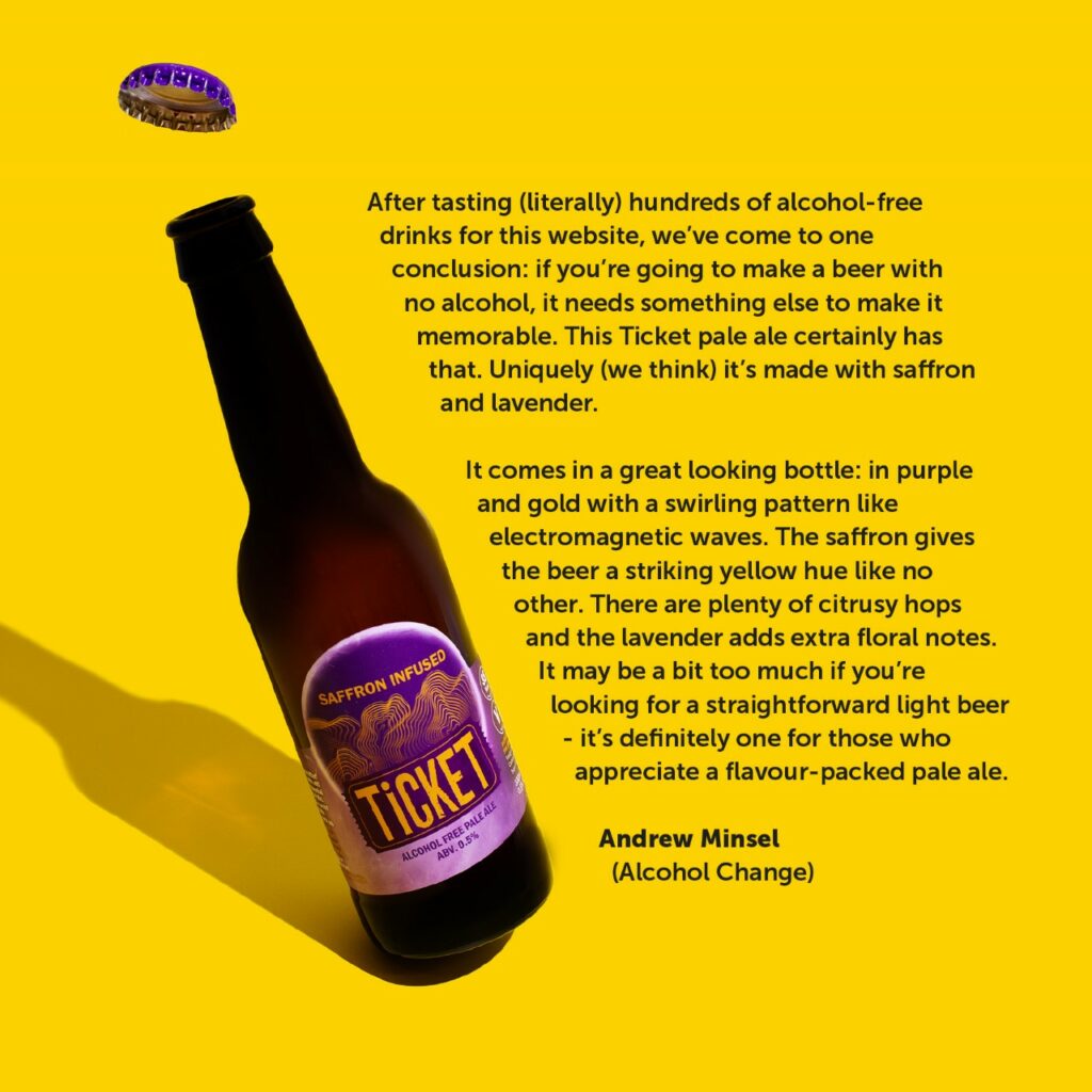 ‘After tasting (literally) hundreds of alcohol-free drinks for this website, we’ve come to one conclusion: if you’re going to make a beer with no alcohol, it needs something else to make it memorable. This Ticket pale ale certainly has that. Uniquely (we think) it’s made with saffron and lavender.
