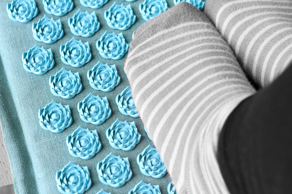 The mat is like a bed of nails, but in the form of pretty lotus flowers. It’s sharp, very sharp. At first I couldn’t stand or lay on it with bare skin as it was quite uncomfortable. The first few times I used the mat I always wore socks or pyjamas. I’ve now become used to the mat so I’m able to stand on it for short periods of time with no socks and I can lay on it with ease each evening.