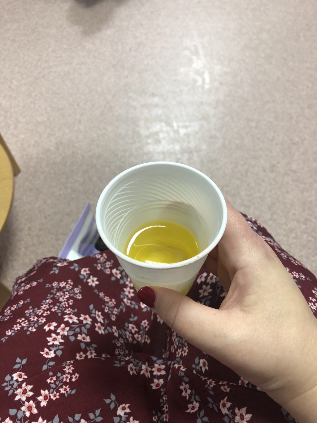 On your arrival you’ll have your blood taken and then be handed a small-ish cup of this orange sugary drink. It doesn’t taste particularly bad, just very sweet. The texture is a little goopy though.